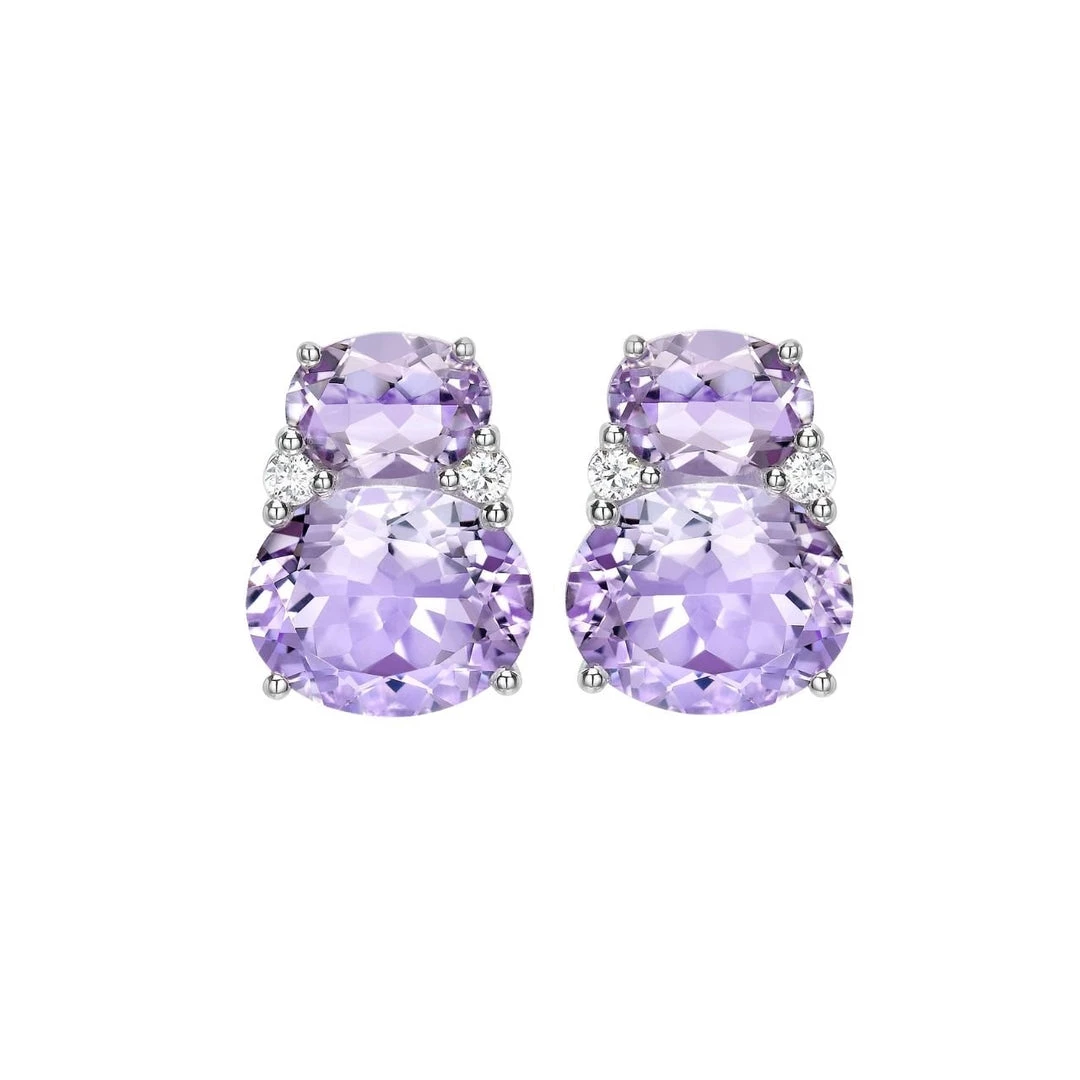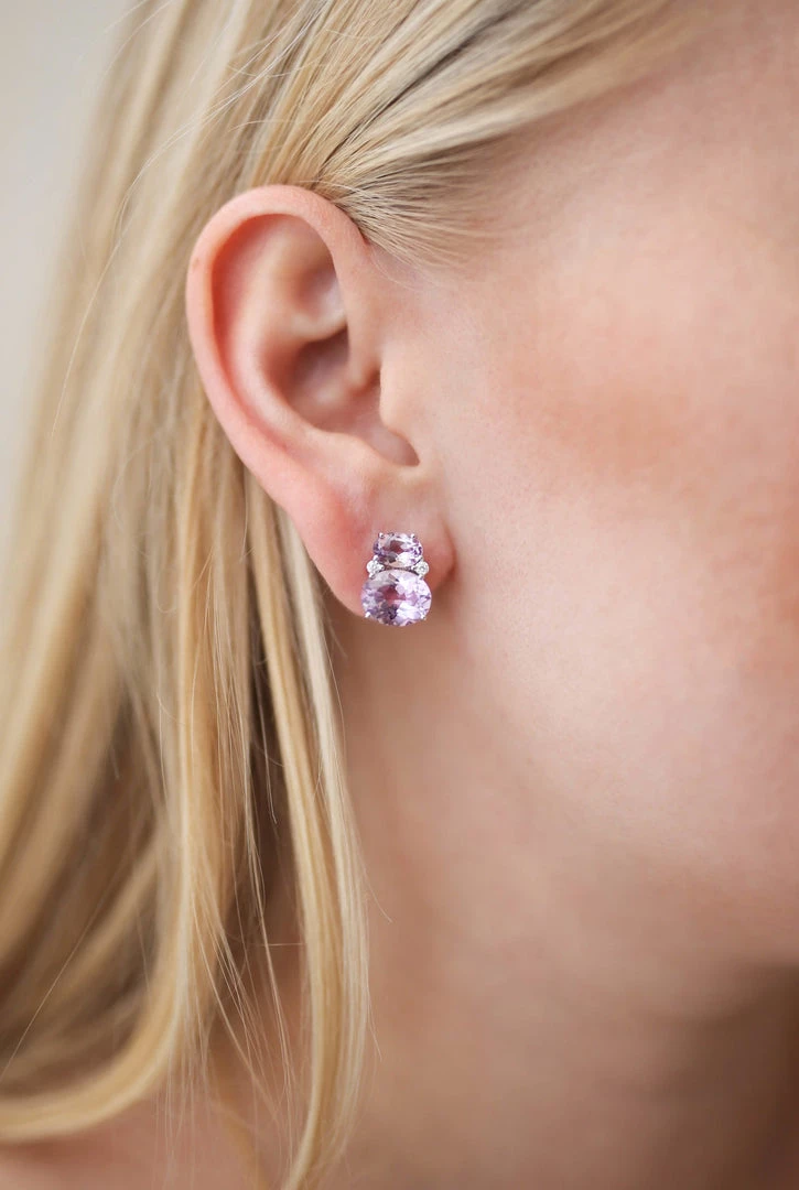 A firm Kiki favourite; these double oval stud earrings come in an array of vibrant colour combinations and are exceptionally easy and fun to wear. This pair features two extremely pretty Lavender Amethyst stones set with Diamonds in 18ct White Gold.